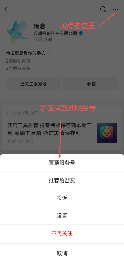 4.4 再点击右上角三个点,选择置顶服务号